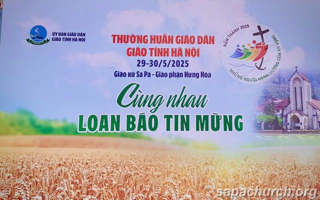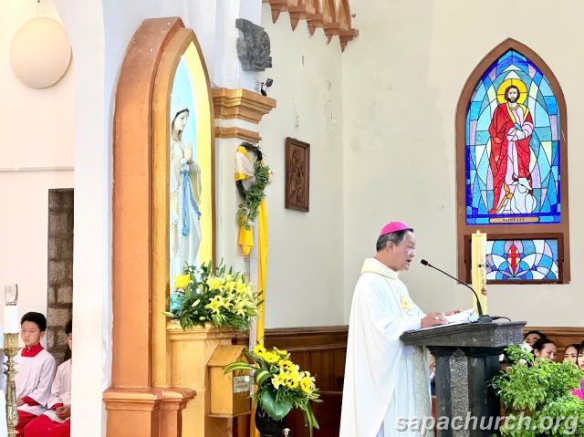 Đức Cha Giuse nói lý do mà Ngài hiện diện ở Giáo Xứ Sapa hôm nay: Ủy Ban Mục Vụ Giáo Dân Trực Thuộc Hội Đồng Giám Mục Việt Nam mà Ngài làm chủ tịch đang có cuộc họp thường huấn tại Giáo Xứ Sapa này, cùng với Quý Cha đặc trách, và khoảng 150 tham dự viên thuộc Ủy Ban Mục Vụ Giáo Dân của 11 Giáo Phận trong Giáo Tỉnh Hà Nội. Chúng ta tạ ơn Chúa trong Thánh Lễ “Chúa Giêsu Về Trời” mở ra cho chúng ta Niềm Hy Vọng, như chủ đề của năm Thánh 2025 mà chúng ta đang lữ hành: “Những Người Hành Hương Của Hy Vọng”. Và việc quan trọng nữa, “Chúa Giêsu không về Trời thôi Ngài còn hứa ban Chúa Thánh Thần”. Chúa Thánh Thần sẽ Thánh Hóa và giúp chúng ta từ bàn tiệc Lời Chúa, bàn Tiệc Thánh Thể này sang bàn làm việc, bàn ăn trong gia đình, bàn tiếp khách trở thành những “Bàn Thánh” và đây là lời mời gọi cho Sứ Vụ Cùng Nhau Loan Báo Tin Mừng, sống chứng tá Tin Mừng, hướng đến niềm hy vọng.